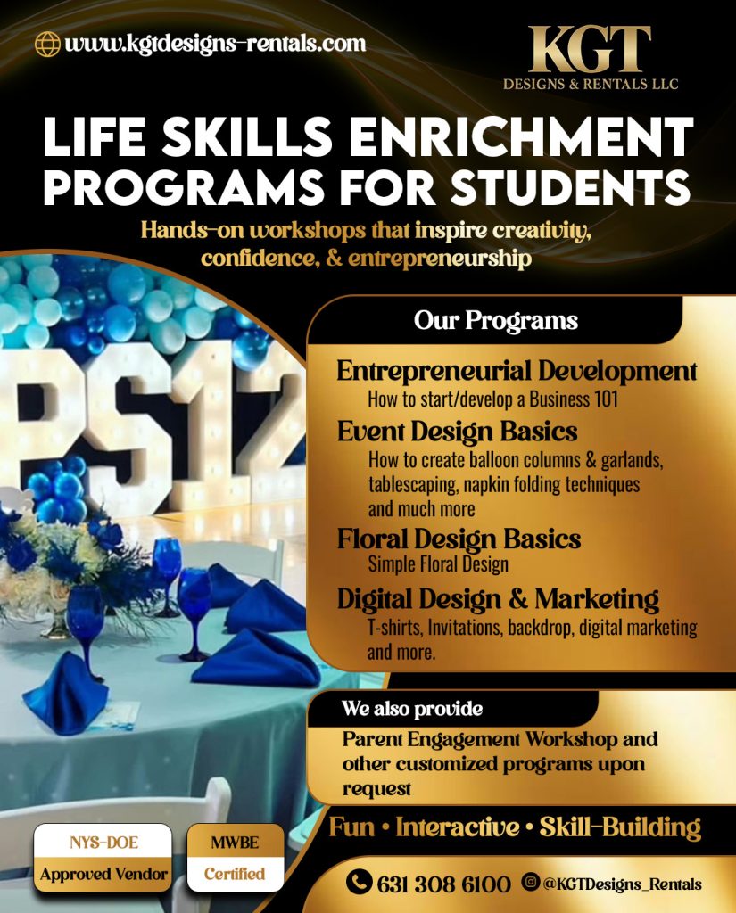 KGT Designs & Rentals LLC is a Certified MWBE and NYS-DOE Approved Vendor specializing in creative event design, décor, and educational enrichment.